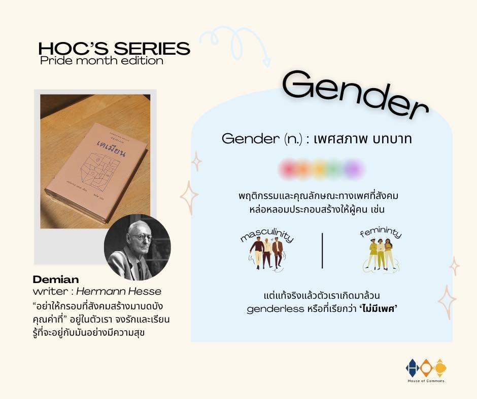 Gender (n.) : เพศสภาพ บทบาท พฤติกรรมและคุณลักษณะทางเพศที่สังคมหล่อหลอมประกอบสร้างให้ผู้คน เช่น ความเป็นชาย(masculinity) และ ความเป็นหญิง (femininty) แต่แท้จริงแล้วตัวเราเกิดมาล้วน genderless หรือที่เรียกว่า ‘ไม่มีเพศ’ แต่กลับถูกสังคมมากำหนดกฎเกณฑ์ให้ซะงั้น!?