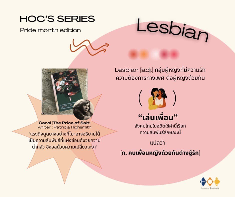 Lesbian (adj) กลุ่มผู้หญิงที่มีความรัก ความต้องการทางเพศต่อผู้หญิงด้วยกัน