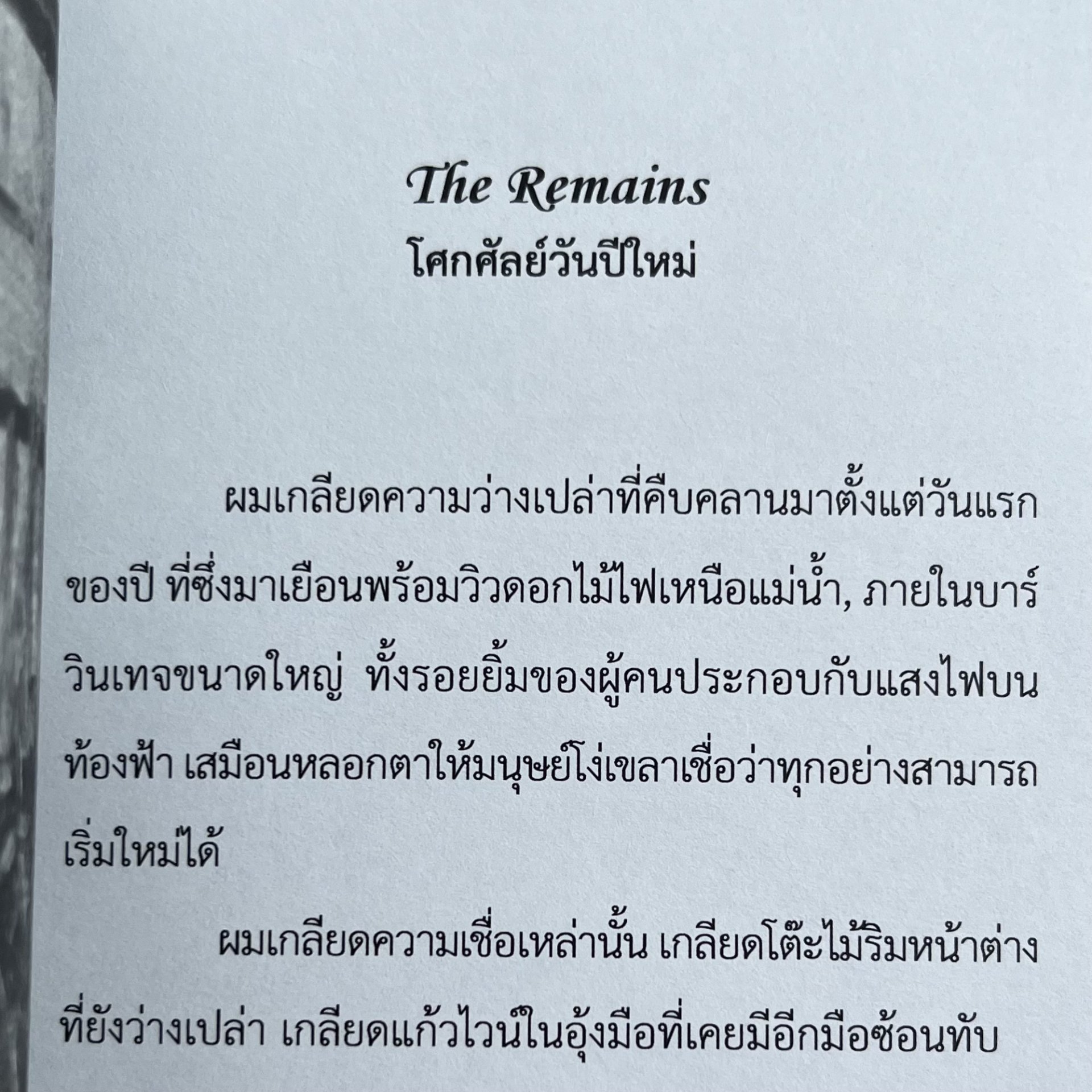หนังสือรวมเรื่องสั้นและกวี ว่าด้วยความรักและการสูญเสีย ผ่านมิติของมนุษย์ผู้ยังหายใจอยู่ท่ามกลางเศษซากของความผูกพัน ผ่านเรื่องสั้นที่ทั้งอบอุ่นและเจ็บแปลบจำนวนสิบเอ็ดเรื่อง และกวีสั้นจำนวนสี่สิบบท ที่ล้วนพาผู้อ่านได้ย้อนกลับมาสำรวจบาดแผล และเรียนรู้ที่จะเติบโตขึ้นหลังการลาจาก